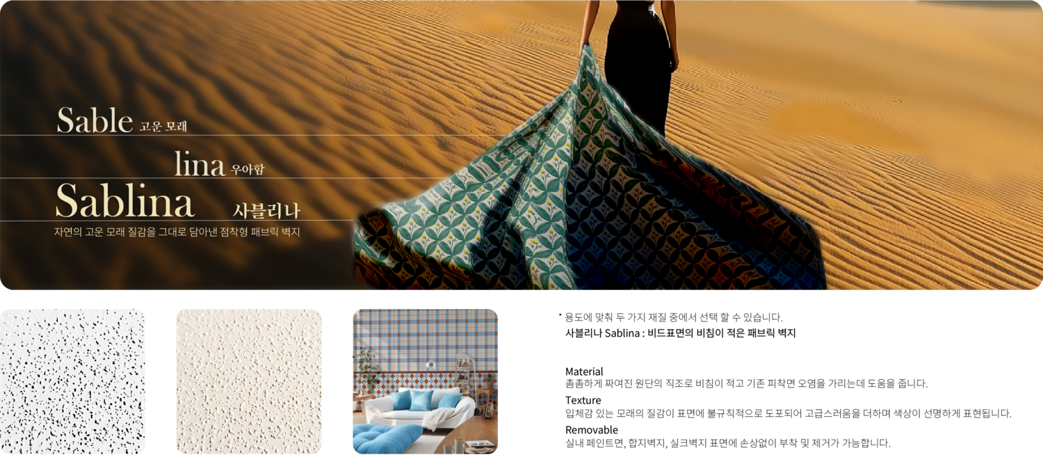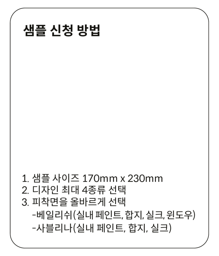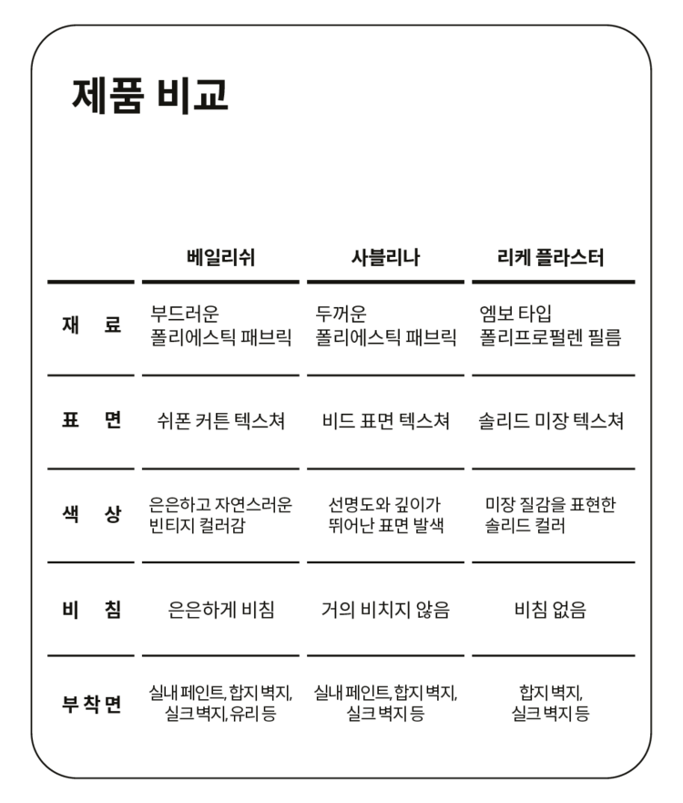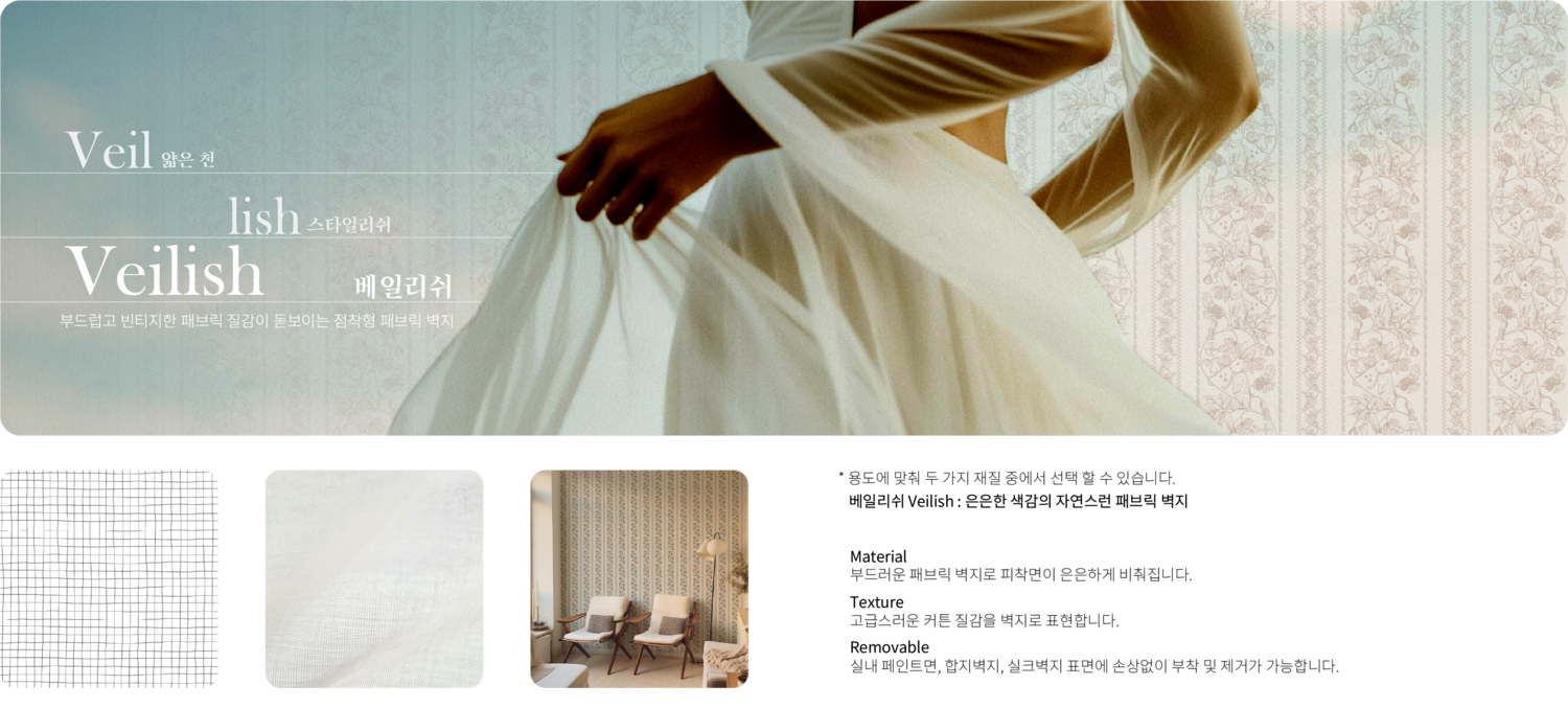 베일리쉬는 벽지 뿐만 아니라 창(유리)에 부착 가능한 점착(스티커형) 패브릭 필름 입니다. 현재 'WINDOW FABRIC FILM'으로 해외 고객에게는 더 익숙한 제품입니다. 스페이스 테일러는 창(유리) 역시 윈도우 베일리쉬를 통해 변화를 줄 수 있다고 믿습니다. 아직 윈도우 데코를 낯설어하는 사람들도 부담스러워하지 않을 디자인을 제안하면서, 더 많은 분들이 자신만의 취향과 개성을 담아 '공간 속 나만의 패턴'을 찾으실 수 있도록 돕는 것이 스페이스 테일러의 목표입니다. 윈도우 베일리쉬는 점착력, 투과력에서 벽지와 차이가 있기 때문에 교차(병행) 사용을 제한 하고 있습니다. (윈도우 베일리쉬를 벽지로 사용하지 마시기 바랍니다.)