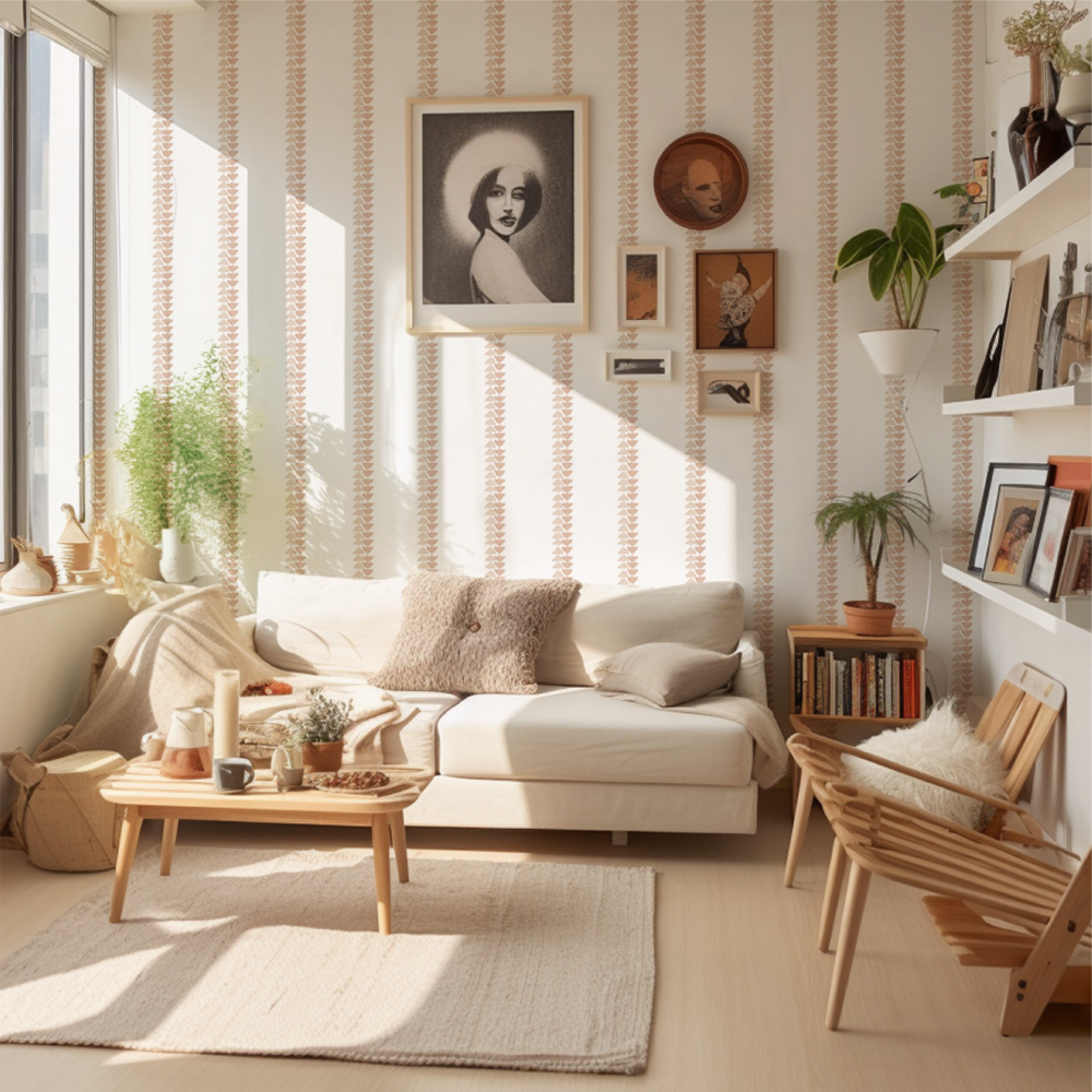 · 여러 롤을 붙일 때는 왼쪽에서 오른쪽으로 붙이시고, 패턴을 이어 붙이기 위해 벽지 우측 끝 흰색 여백 (0.4cm) 위에 겹쳐 시공 하시면 됩니다.
